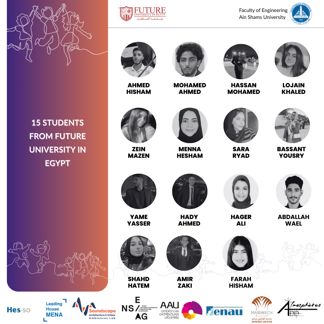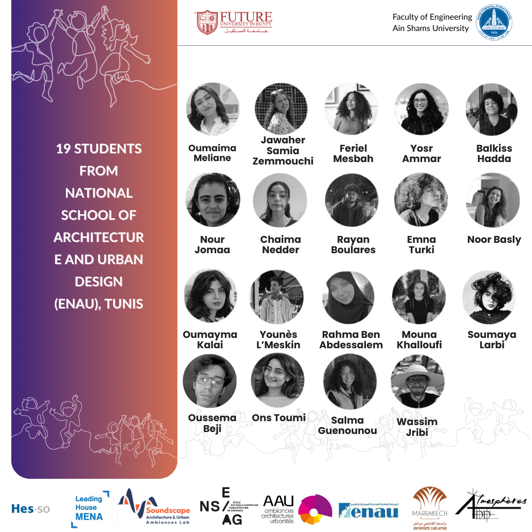 - المشاركون: أكثر من عشرة أساتذة وباحثين دوليين، وطلاب المدرسة القومية للهندسة المعمارية والعمران بتونس، وأعضاء هيئة التدريس والهيئة المعاونة والطلاب بجامعة المستقبل وكلية الهندسة جامعة عين شمس.
